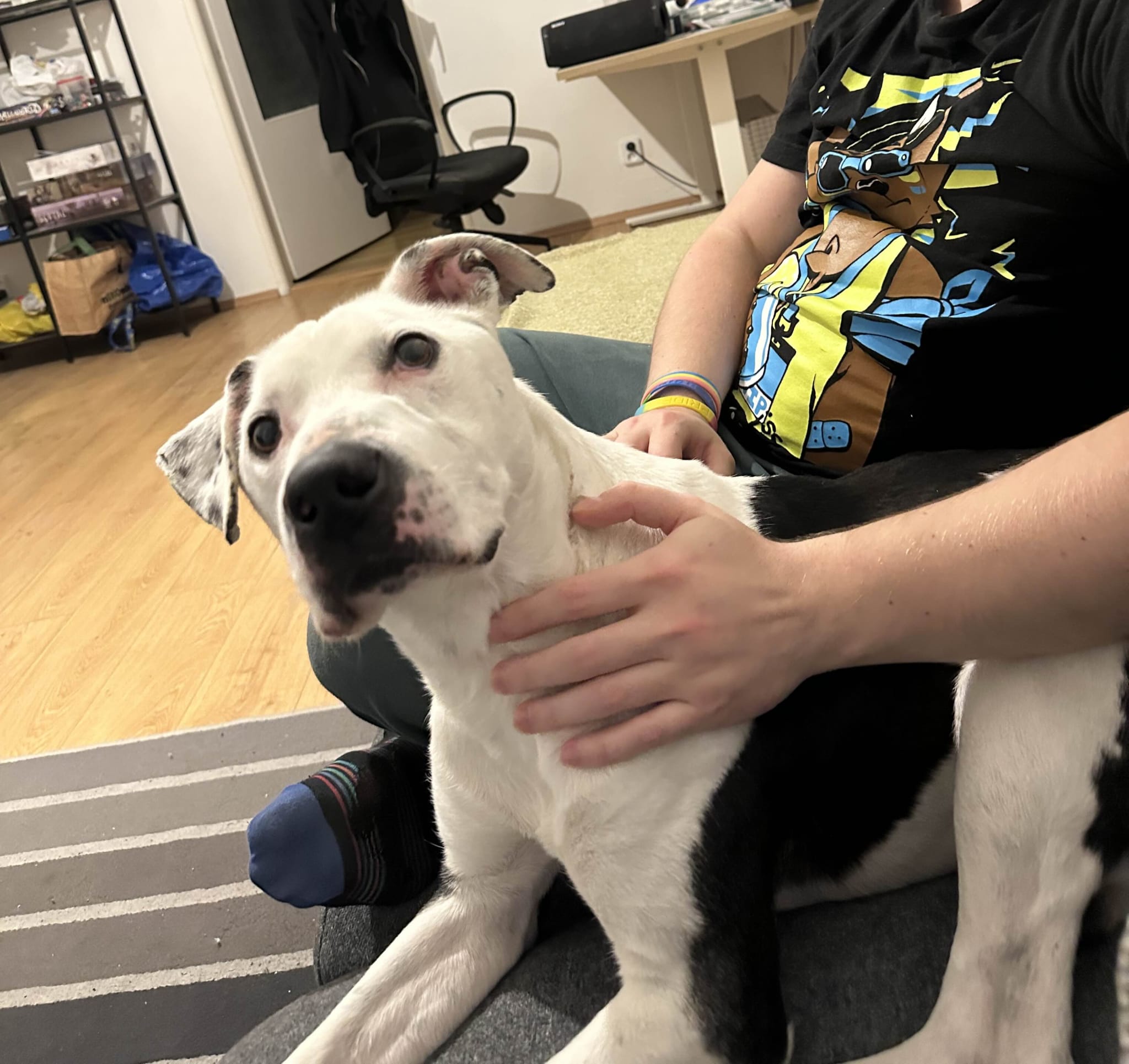 Boogie is now thriving in Prague in foster care! We quickly moved him there after having him for some days in our shelter. He already shows progress around food: he now sits and waits instead of bouncing like a space hopper! Best of all, this house-trained boy is energetic outside but an absolute couch potato inside, finally accepting that the bed is his off-limits throne. 😃